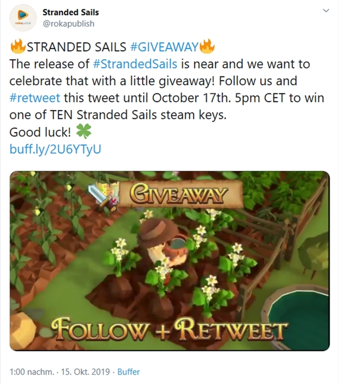Get one of 10 Steam Keys in our giveaway promotion on Twitter! First videos and streamings of Stranded Sails to be released from October 16th, 00:00 am PDT. Check out your favorite streamers, maybe they have already tested the game for you!