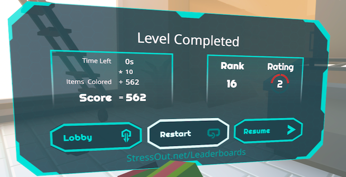Another thing that annoyed new players is the way level ends. There was no time to experiment in a level or find the remaining collectables. You had to retry the level. Some players were also confused by the fact that they were teleported out when they reached rating 4. Now, once you reach rating 4 menu opens that lets you continue/restart/go to lobby. It also shows new stats.
