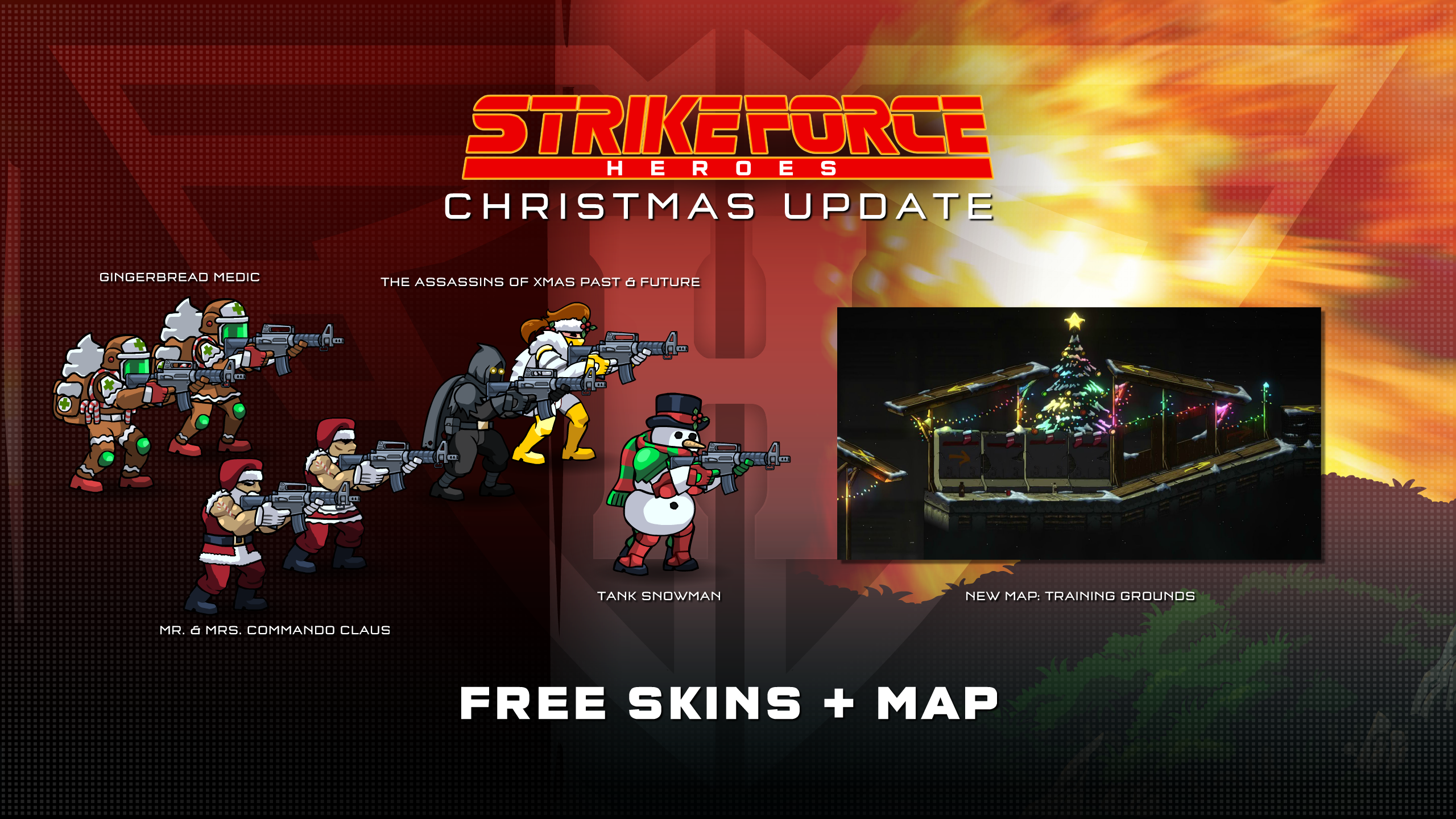 To help everyone get in the spirit, we're updating the game with free Christmas themed skins and a new map! Each Hero receives a brand new Legendary skin (with female variants) that can be found in the shop and slot machine.