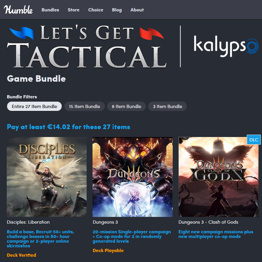 Weโre excited to team up with Humble Bundle to present the "Letโs Get Tactical with Kalypso" bundle! The tiers are 1$, 7$, 10$ and 15$. Included are great tactical and strategic games like Sudden Strike, Dungeons and Commandos.