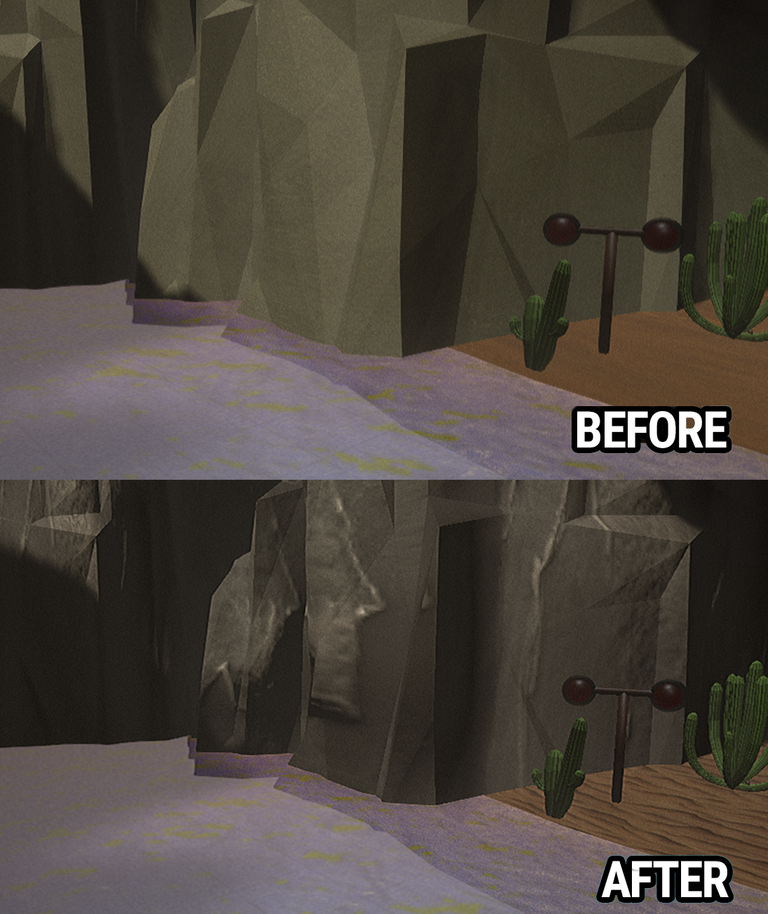 Took a minor pass at the character shader, removing the contrasting gradient front-light, and reducing the thickness of the black outlines on characters. The goal of this was to make the characters feel more consistent with environment updates that took place this update.