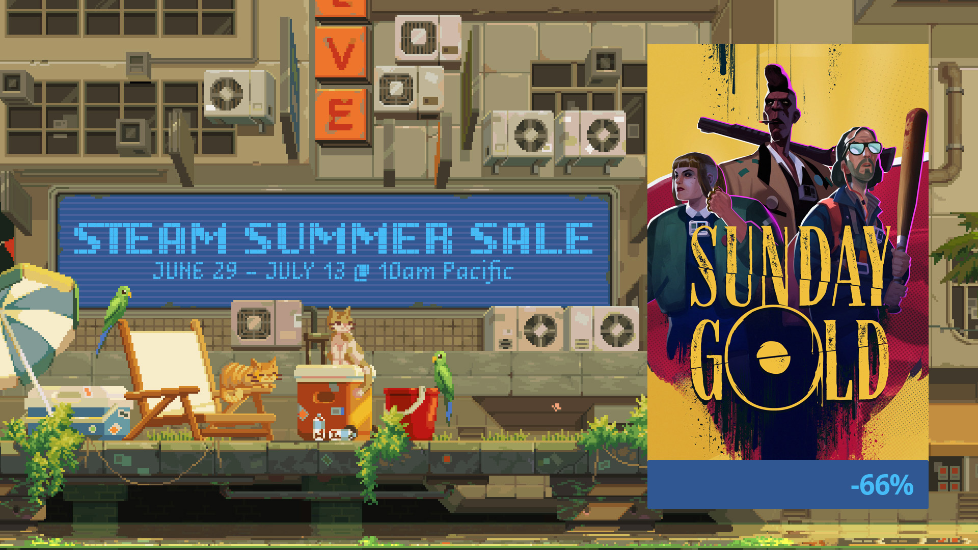 And, even better, Sunday Gold is available to purchase on Steam right now! Keep up to date with the word on the street by liking us on Facebook, following us on Twitter, joining us on Discord, or by checking out the Sunday Gold website.