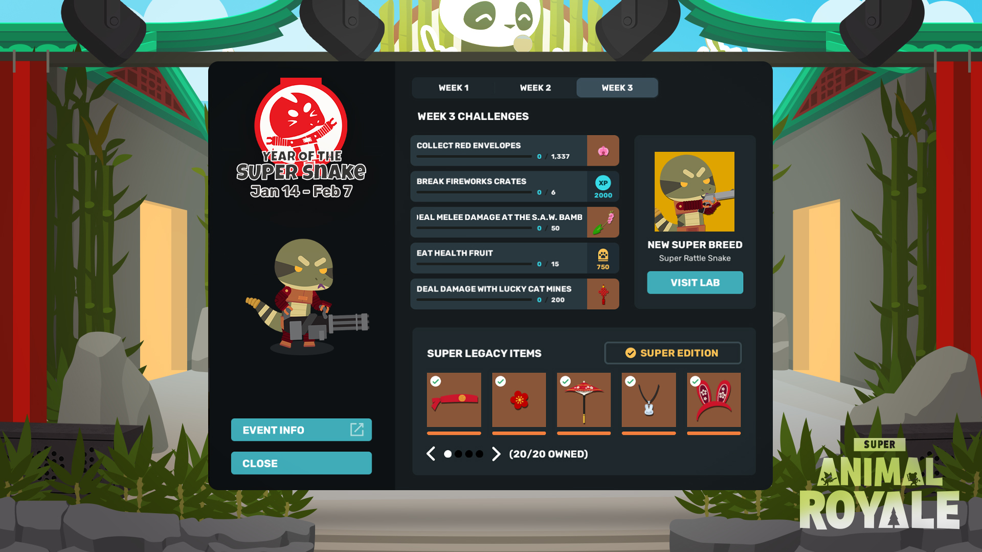 Missed out on the first two weeks of the Year of the Super Snake? Don’t shed a tear! All challenges from Weeks 1 and 2 will still be slithering around and available to complete until the event wraps up on Friday, February 7th. Plus, as always, every new breed is a permanent addition to the Research Lab!