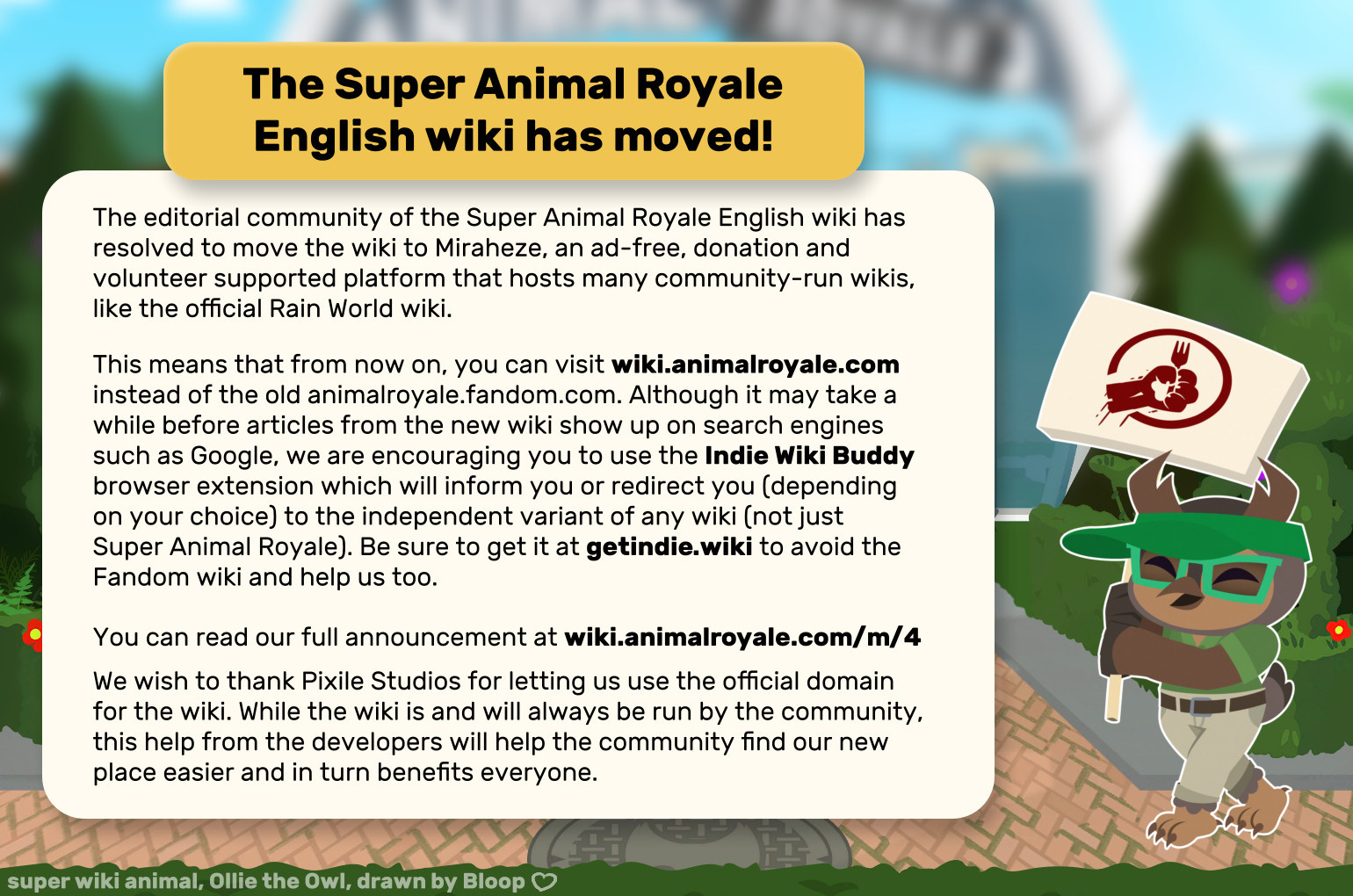 Our community-run wiki has a new home! Super Animal Royale's wiki is now hosted at wiki.animalroyale.com.