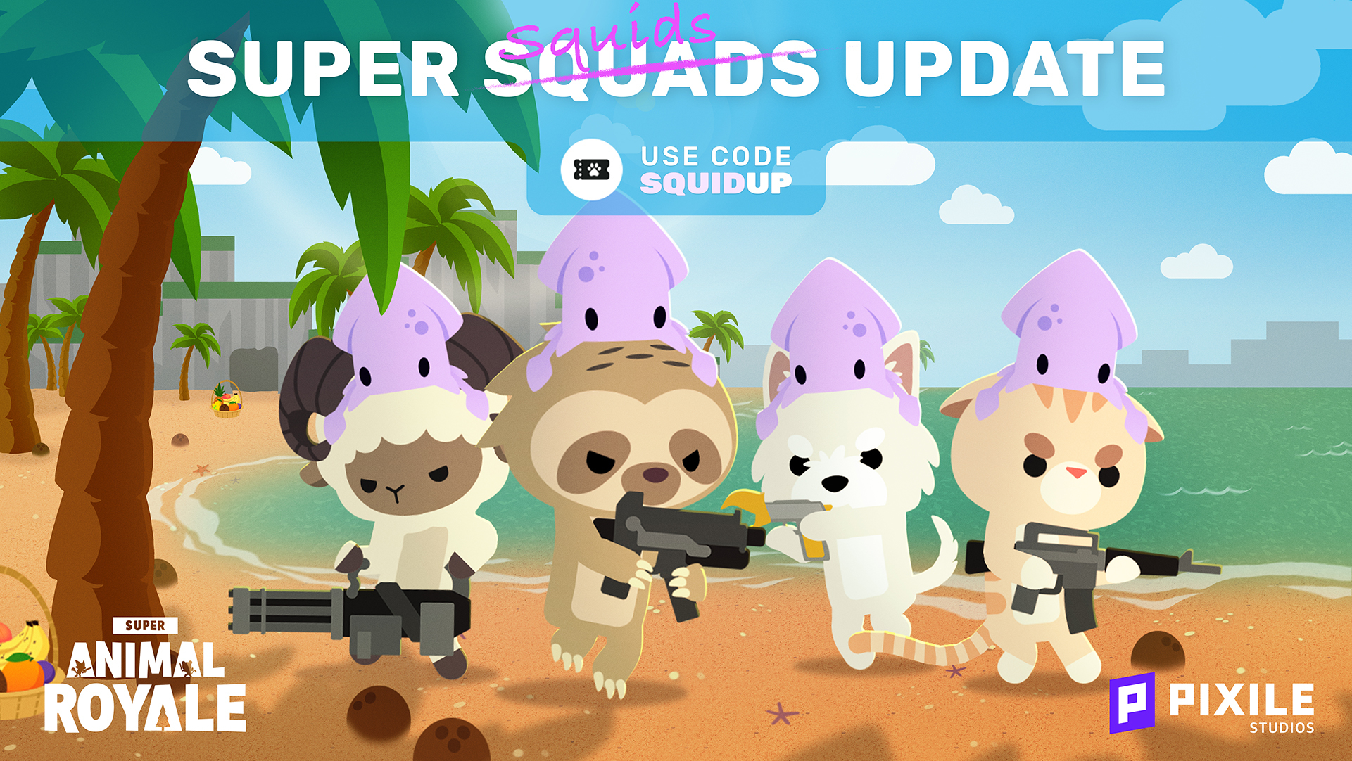 The time has finally come to officially debut Squads as a permanent mode alongside Solo and Duos modes! And to all you crazy Super Animals in Discord who have been requesting the ability to Squid up since Monday, we’ve heard you loud and clear and have implemented the most important feature of all: squid hats. Just enter the code “SquidUp” into the coupon code field in the main menu to earn the ability to squid up with your super friends. You’re welcome.