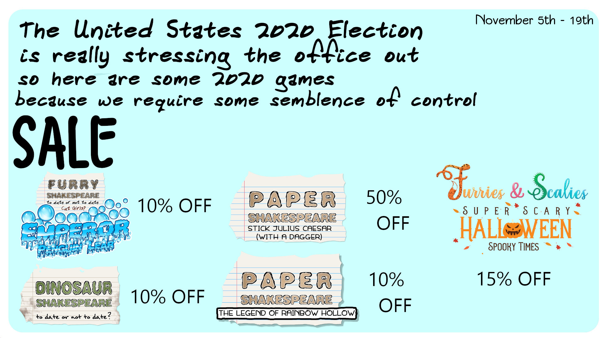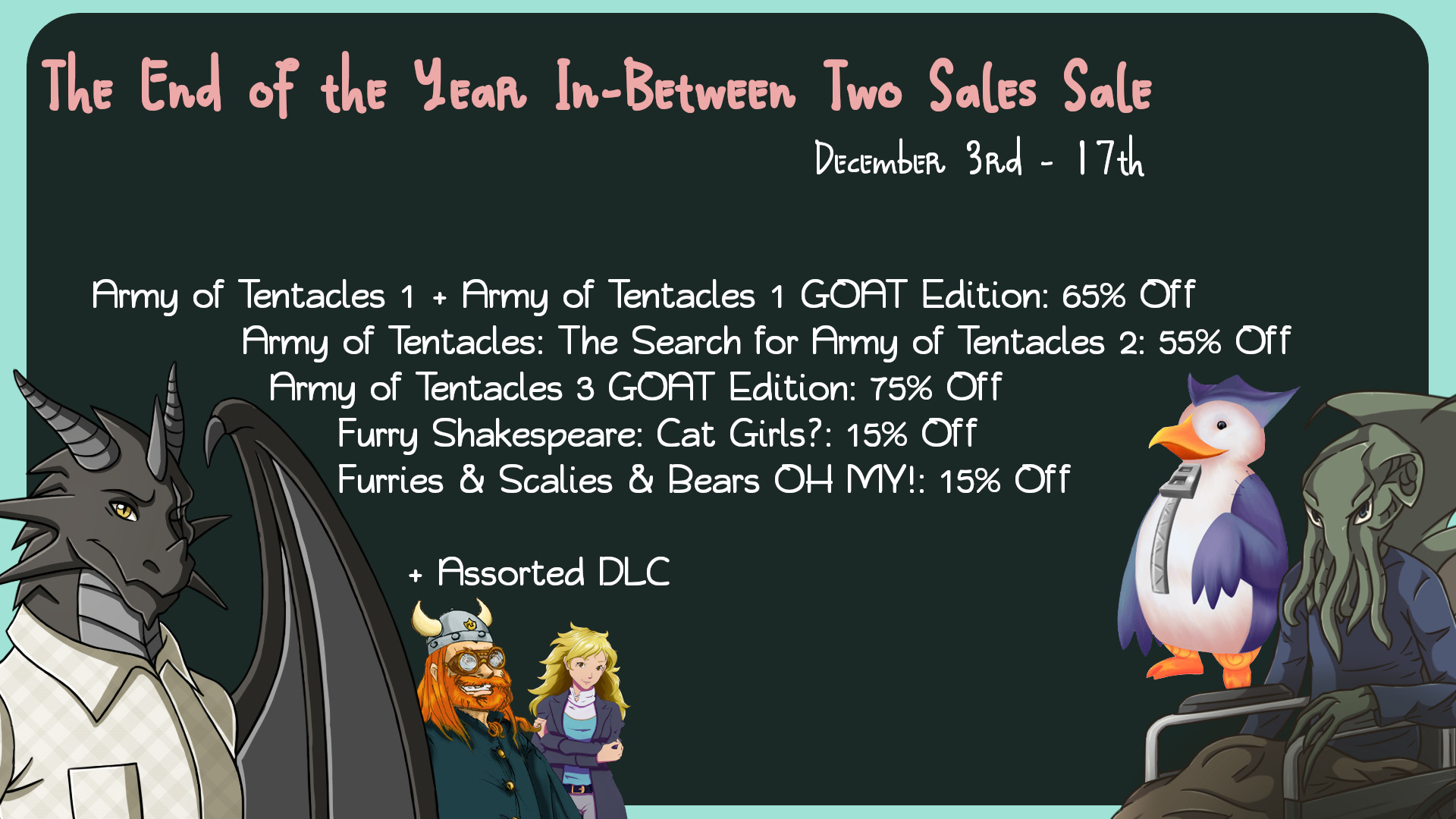 As these are games for an investor, we wanted to knock them out as soon and efficiently as possible while still launching good games. It's also that the Furry/Paper Shakespeare series has generally been more profitable than Furries & Scalies, so that's another reason. Had we all the time and money in the world, all three would be coming out before summer 2021, but that workload would eventually hurt Army of Tentacles 2021. Yes, one could bring up the claim that having an investor has affected us, but only in the sense of what products come first (and that honestly is the ideal situation). We're still making what we want to make next year. We still have creative freedom.