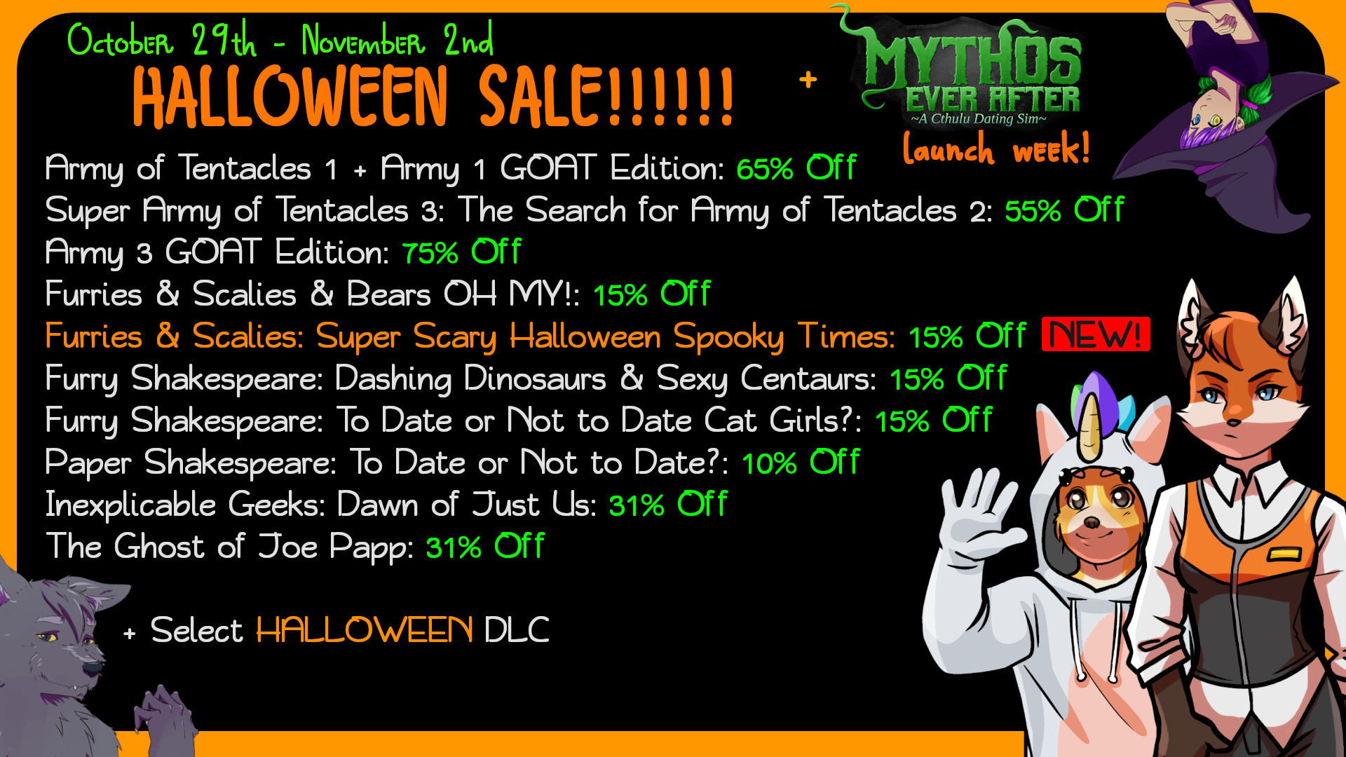 A few of our smaller games, plus Furries/Bears 2, have changed to 2021. This isn't due to the sudden addition of Mythos Ever After: A Cthulhu Dating Sim, but rather, because our artists and writers need more time, and we need further assets that we didn't really account for in the budget. We figured that, if the games are delayed anyway, they might as well be clear off the current foreseeable (or at least further off than, say, January) release schedule.