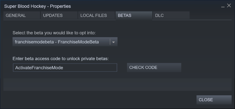 5. Select the FranchiseModeBeta from the drop down menu. (Note: if after entering the password the build does not appear, please restart your Steam client)