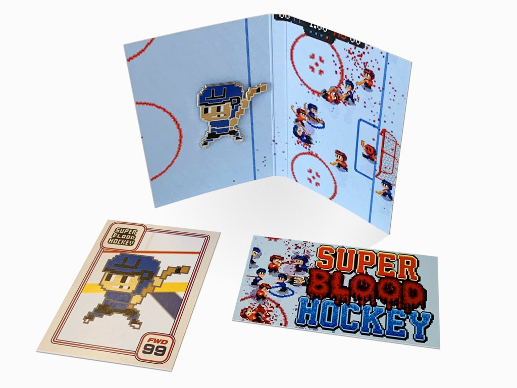 The team at IndieSection.com produced a limited quantity run of custom designed enamel pins featuring Super Blood Hockey. It comes with a copy of the game and a bonus goodie as well!