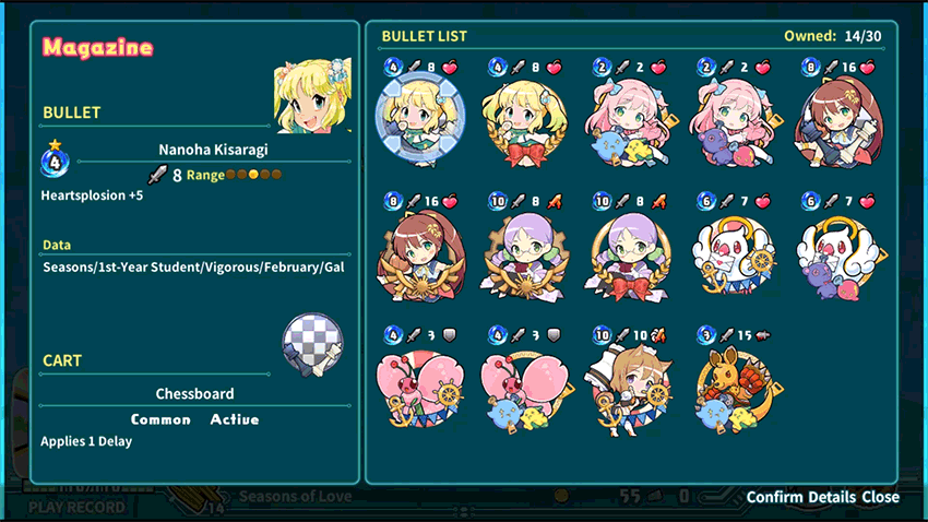 First, and most importantly, there's no Super Bullet Break without its Bullets and there are over 160 of them - plenty to choose from! They're each beneficial in their own way and their data will not only show their Name but also their Rarity, Cost, Ability, Attack Power, and Attack Range.