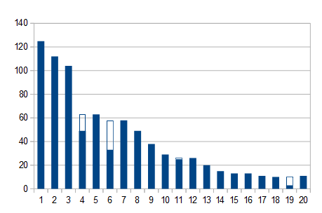 This attracted my attention so I generated a simple graph showing the number of leaderboard entries per stage. To get your name in the leaderboards, you have to complete each stage so essentially this is a graph of the game's difficulty curve.