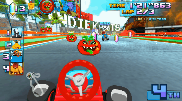 <*> ADDED ABILITY to drag some weapons behind your kart by holding the weapon button before dropping them (Meloons, Gelatos, Pangapples, and Loconuts) so they can be used as a rear shield