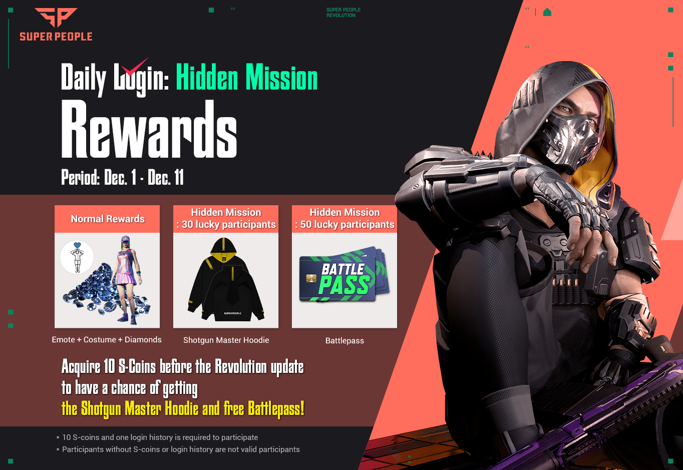 Complete SUPER PEOPLE Daily Login missions by collecting 3/5/8 or more “S Coins”! Log in to SUPER PEOPLE now and receive event rewards.