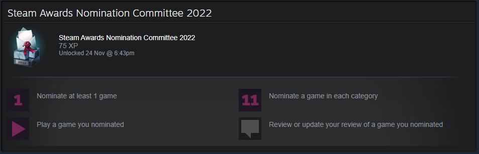 Those who vote will be automatically registered in the "Steam Award Nominee Recommendation Committee" mission, which will award a badge that can be used in the Steam Community once completed. - The design of the badge will get cool upgrades depending to the numbers of missions you have completed!