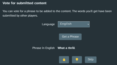 We also have a system in place, that helps to expand the content for all languages: So let’s say a player adds a new German phrase to the database via our content submission system. This phrase is then auto-translated into all the other languages we support. But here comes the catch: We won’t add this phrase to that language database right away, but add it to a second separate database, where you can vote on the quality of that phrase. Only if the phrase gets a significant number of upvotes, it gets added to the general database with all phrases for the game. This way we ensure the quality of the phrase database, while also giving you, the community, a way to add more content to the game.