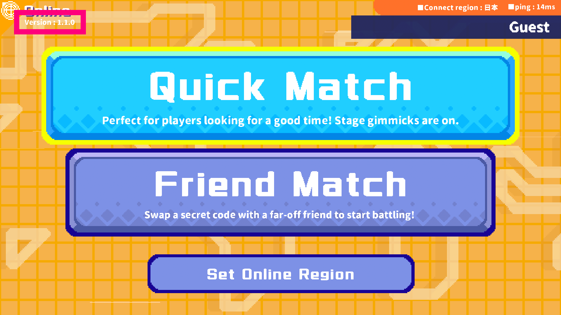 When playing, make sure that the version displayed in the upper left corner of the "Online" mode menu ("Version : ○○") is the same as that of the player you are playing with. If the version is not the same, you will not be able to play online. ----------------------------- If you have the full version of the game or are thinking about playing with friends, please take advantage of the "SUPER UFO FIGHTER Friend's Pass" as well!