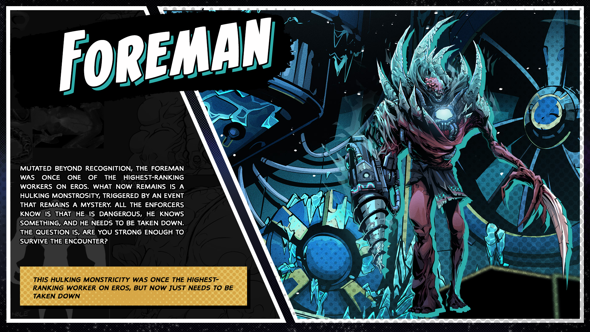 Mutated beyond recognition, the Foreman was once one of the highest-ranking workers on Eros. What now remains is a hulking monstrosity, triggered by an event that remains a mystery. All the Enforcers know is that he is dangerous, he knows something, and he needs to be taken down. The question is, are you strong enough to survive the encounter?
