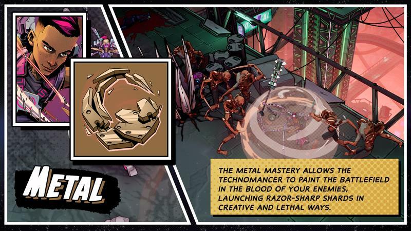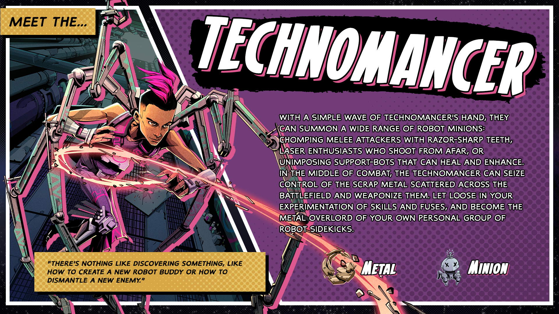 The time has come to introduce our third and final Enforcer for Early Access - The Technomancer. A feisty young tech genius, the Technomancer has the ability to bend metal to their will, whether it is used to lob scrap metal at groups of enemies or fabricate robot friends to fight alongside them in battle.