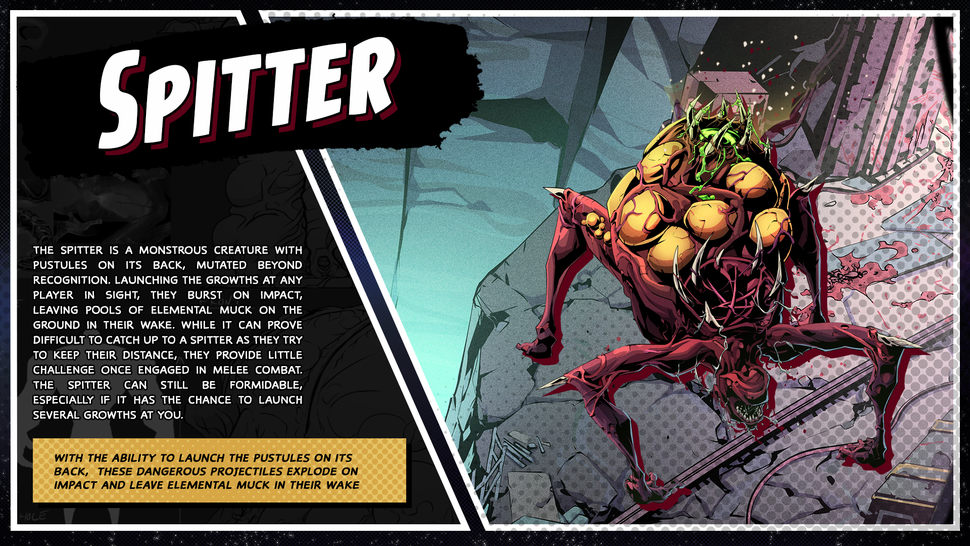 The Spitter is a monstrous creature with pustules on its back, mutated beyond recognition. Launching the growths at any player in sight, they burst on impact, leaving pools of elemental muck on the ground in their wake. While it can prove difficult to catch up to a Spitter as they try to keep their distance, they provide little challenge once engaged in melee combat. The Spitter can still be formidable, especially if it has the chance to launch several growths at you.