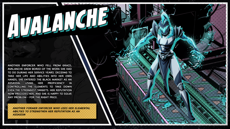 Another Enforcer who fell from grace, Avalanche grew bored of the work she had to do during her service years. Deciding to take her life and abilities into her own hands, she entered the black market as an assassin, using her proficiency in controlling the elements to take down even the strongest targets. Her reputation now precedes her, and she is happy to solve any problem - for the right price.