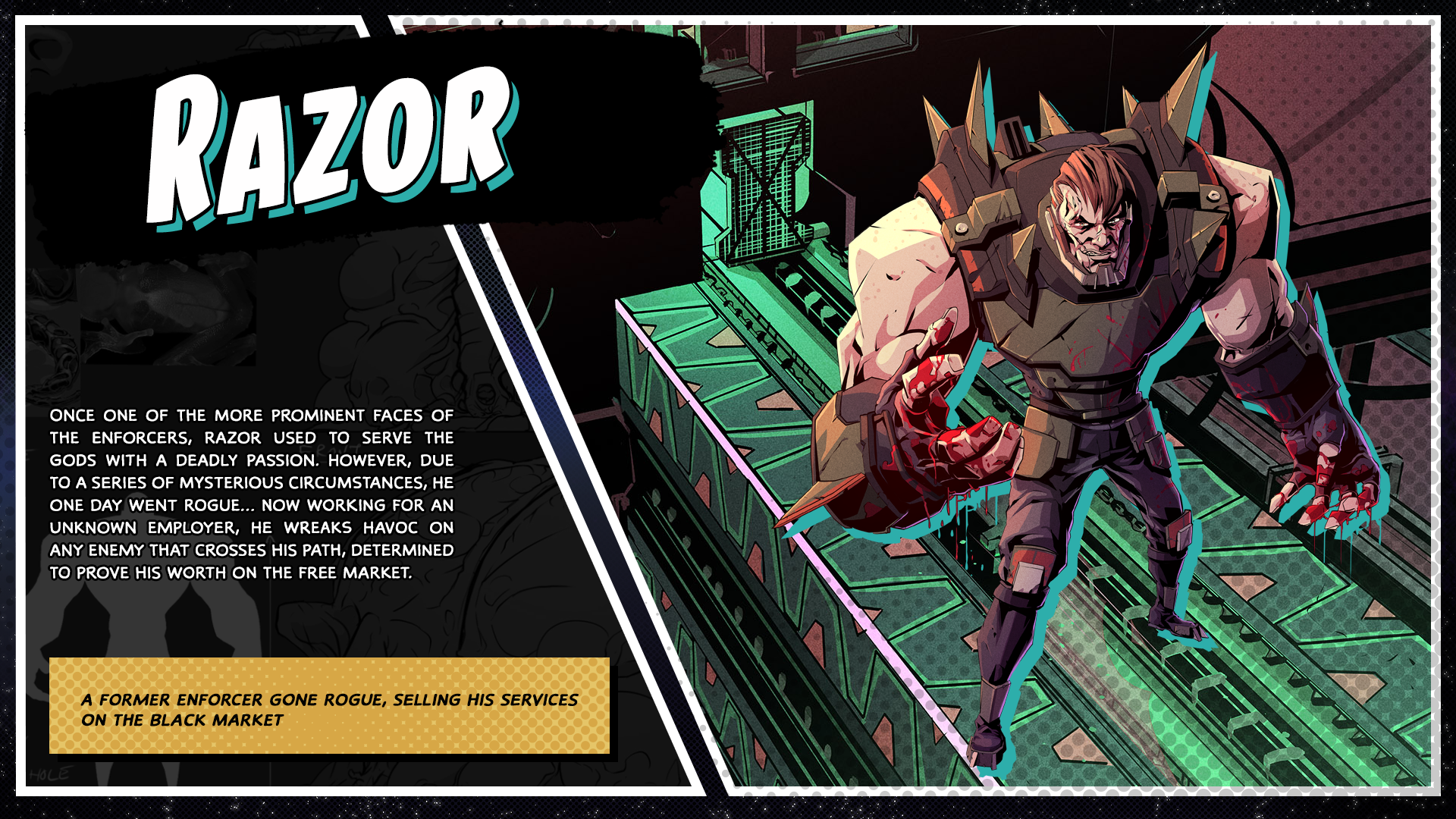 Once one of the more prominent faces of the Enforcers, Razor used to serve the Gods with a deadly passion. However, due to a series of mysterious circumstances, he one day went rogue… Now working for an unknown employer, he wreaks havoc on any enemy that crosses his path, determined to prove his worth on the free market.