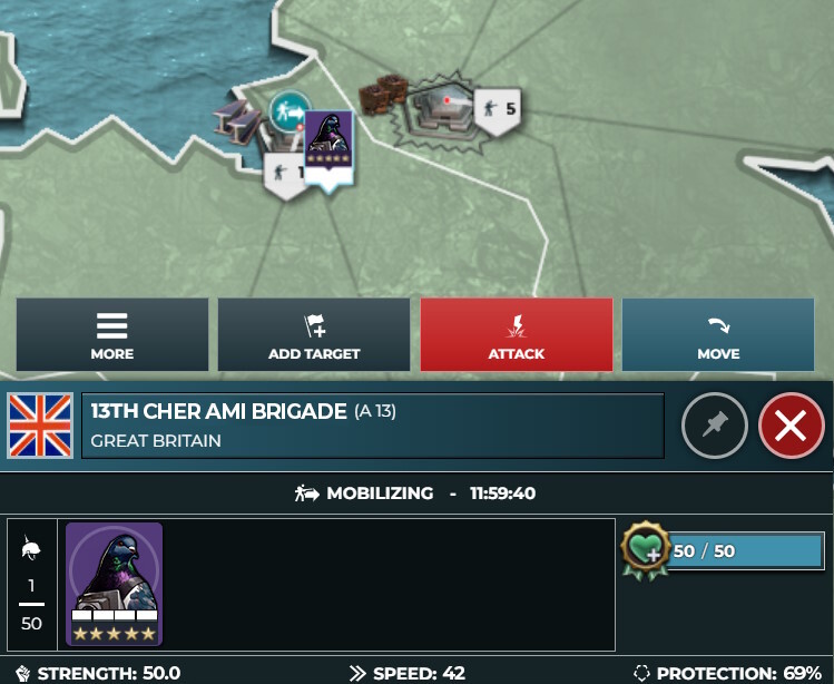 Ration Raid (Activated Ability – 24h Cooldown) – Cher Ami targets a specific Infantry stack, summoning a cloud of rogue pigeons to devour their grain supply.