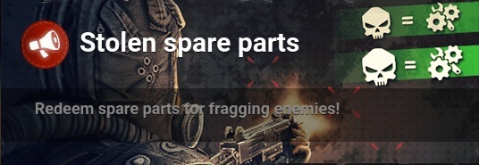 Play in the "Stolen Parts" event this weekend! During the course of the event you will get an extra spare part each time you kill an enemy. The more frags you get, the more spare parts you earn after the match. Bonus spare parts are added in addition to rest of the rewards earned when the match ends.