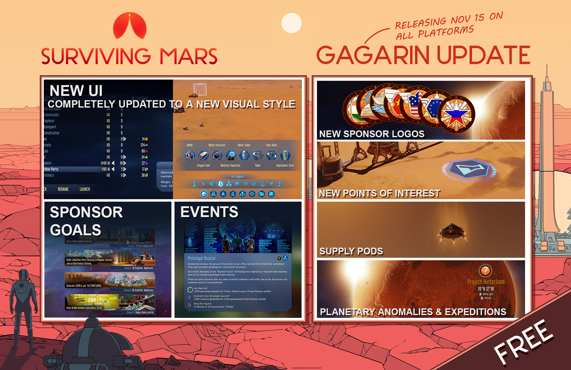 Sponsor Goals - Each sponsor now provides a set of five unique goals. Completing those goals awards various rewards – from Funding and Applicants to free prefabs of Domes and even free Rockets.