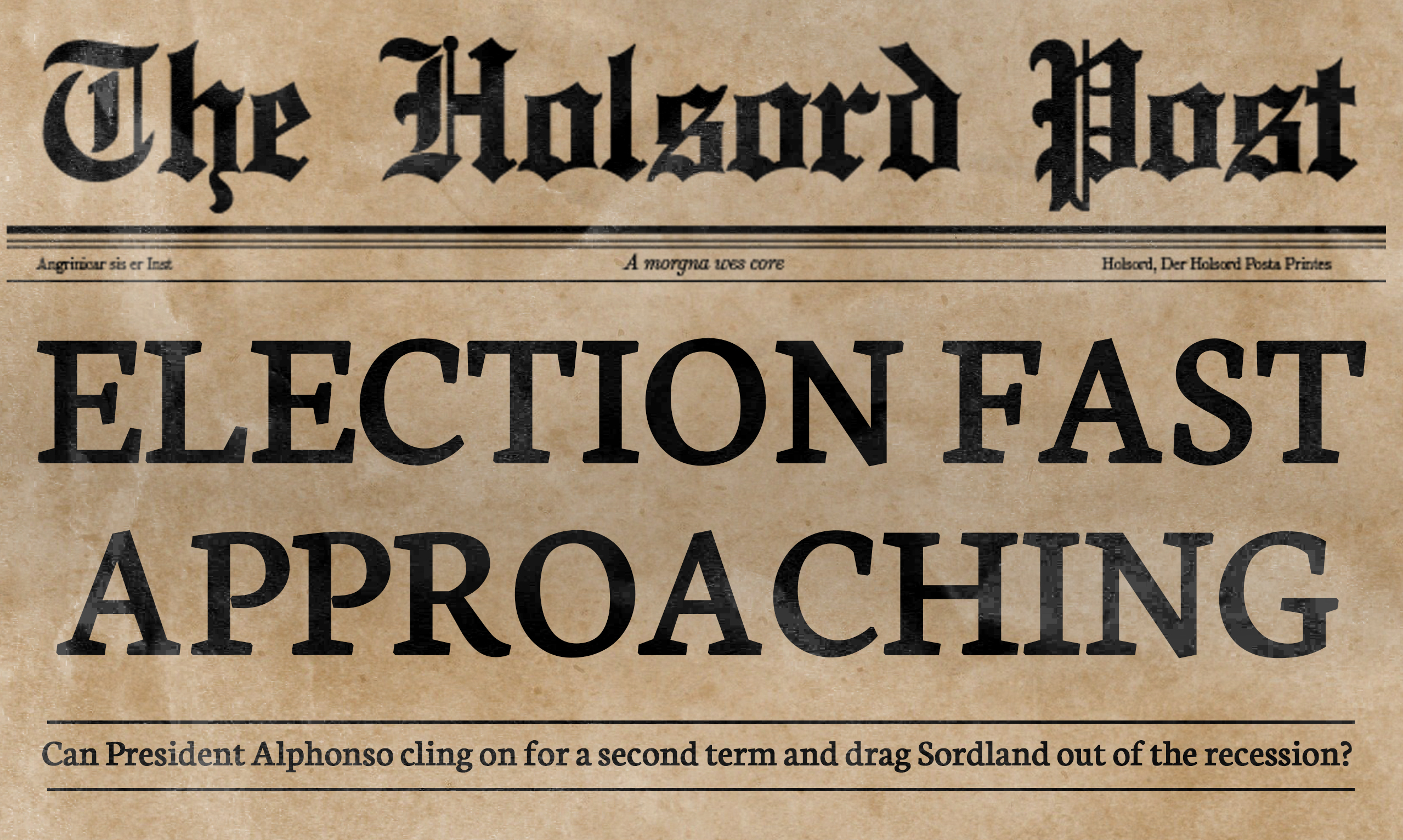 We’ve been hearing rumors the 1953 Sordland presidential election will take place in a few months’ time, and with the low state our great Sordland has fallen to, The Holsord Post is not expecting current President Ewald Alphonso to be voted in again as the leader of the United Sordland Party.