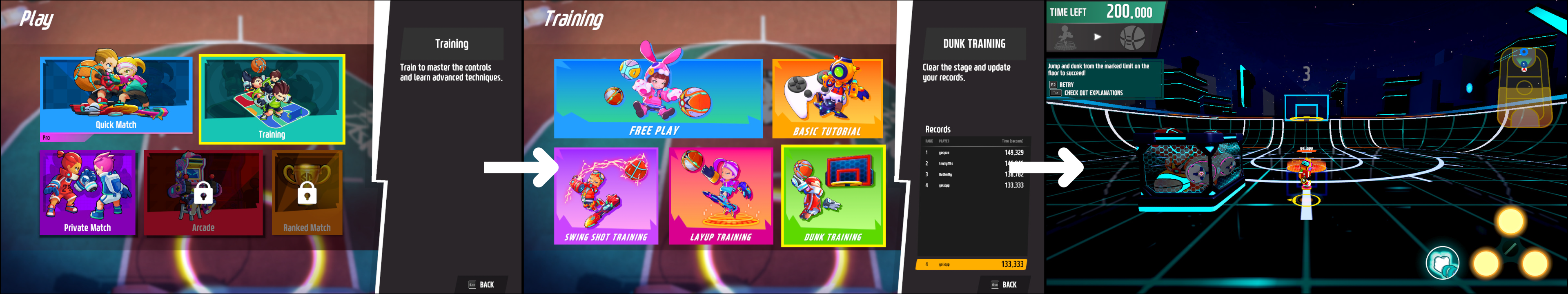 ■ Dunk Training has been added to practice dunks. ■ Click on the Play Menu > Training > Select Dunk Training. ■ Clear the 10 stages within 200 seconds to succeed.