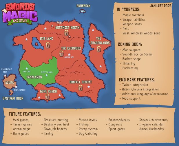 All of the zones from before are still present aside from Dragonlands, but a lot of new zones have been introduced. When the first map was made, there wasn’t really a detailed plan with what to do with the whole area, nor any idea of the time it would take to fill it out. Michael has been working on re-scoping the world map for a better story, progression, and transition between zones. This will make it easier to get more zones out faster as well. For example, Iris Lake was originally somewhere around 6-8 times bigger than Farmlands. The Farmlands took somewhere around six months to complete (it also included crafting, farming, cooking, etc. which took time). If we wanted to release Iris Lake as it was before, it would take over two years to get the one zone out! With this new layout, we can easily break up the workload.