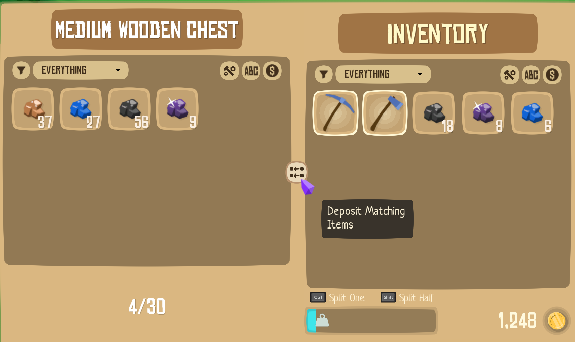 This update also introduces a bunch of much-needed inventory tweaks, like a better stack splitting feature, the ability to split stacks into other inventories, and a button to deposit matching items into an inventory, saving you tons of time when dropping off loot after an adventure.