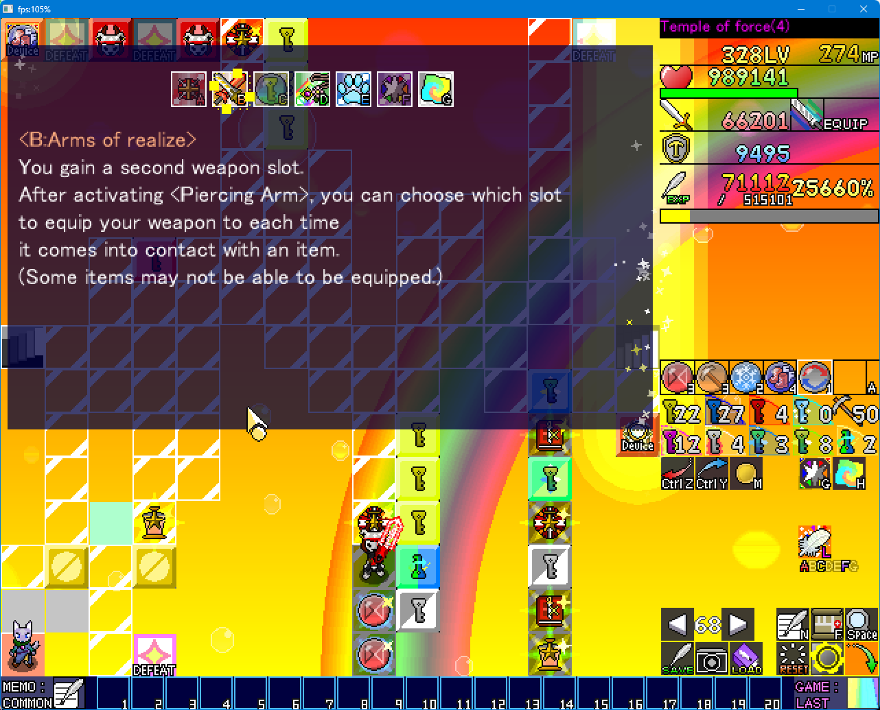 There are a few reasons for this, but while you can play through high-difficulty stages and wide stages with 50-70 floors well when you're “in the zone” and playing through them as a test, when you play them a second or third time, you really want to be able to “refer to past data”. In other words, you get the feeling that you want more information to be presented about “what strategy you used to clear the stage the last time you tried it”. We implemented a function called that saves the history of previously opened locks, but to be honest, I also wanted information such as “at what level did you unlock this door?” and “what did you choose for your last level-up bonus?” to be displayed. Also, I don't know how far this can be taken, but if it's possible, I'd also like to see a history of things like the use of orbs.