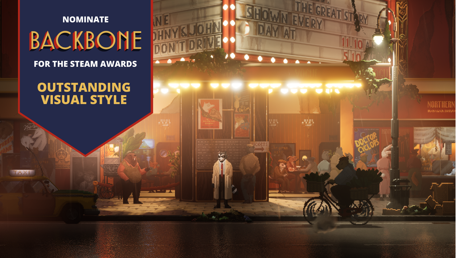 If you've felt compelled by Backbone's distinctive aesthetic, we hope that you can find a moment to consider nominating it for the 'Outstanding Visual Style' Steam Award. Thank you for your time and continued support.
