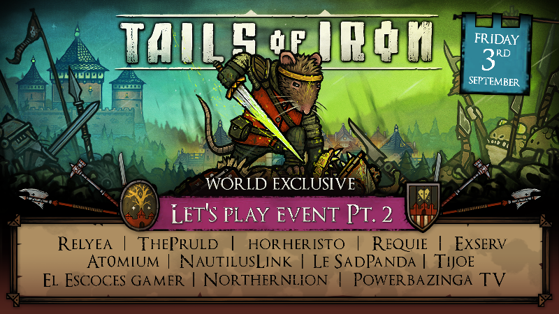 With the release of our upcoming adventure-RPG, Tails of Iron, literally around the corner (17th September in case you’d forgotten!), it’s time to clean your ears and sharpen your eyes to the beats of glorious ‘Let’s Play’ content - live on YouTube and Twitch from 5pm BST (6pm CEST, 9am PST) today (3rd September)!