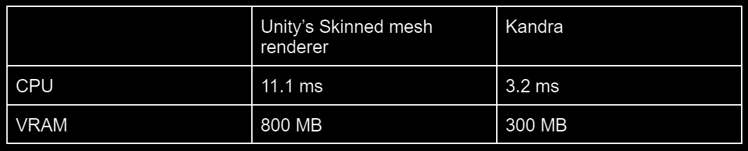 Results of our internal tests. It shows the cost of rendering 150 NPCs on an empty scene.