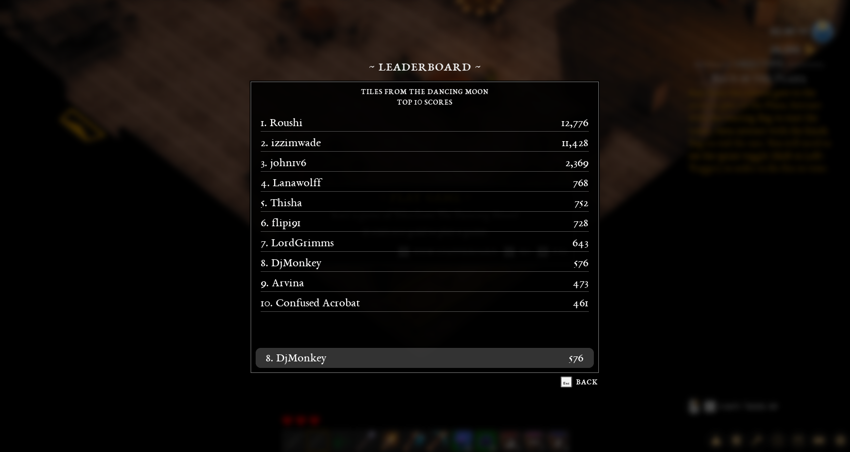 I wanted to highlight a particular fun moment from my players over the last month. Particularly between Izzi and Roushi over on Discord who have fought to claim the top spot in the Tiles from The Dancing Moon mini-game!