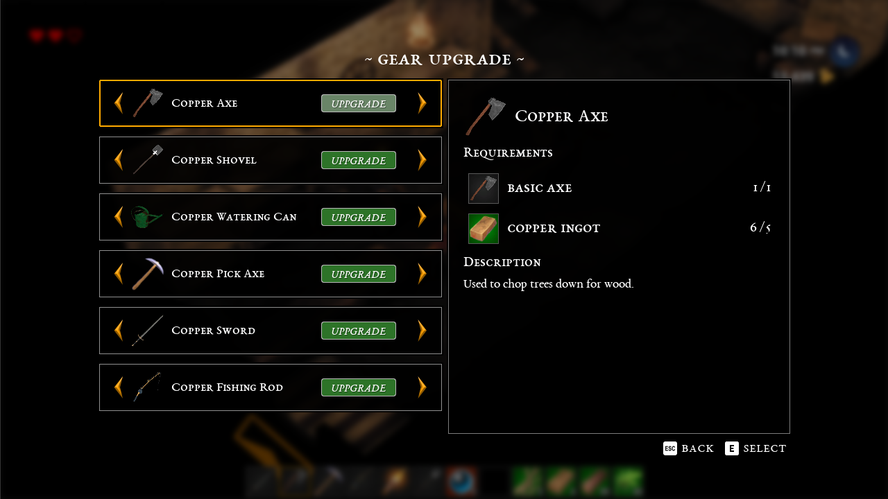 The first I want to show is the new gear upgrade system. By the time the player finishes all the tutorial quests, you'll have an arsenal of tools at your disposal, such as axes, shovels, swords, and fishing rods. In their most basic form they will only be useful at the early stages of the game and will require upgrading as you advance. These upgrades will also give player perks like dealing extra damage, chopping down trees faster, or extracting rarer materials.