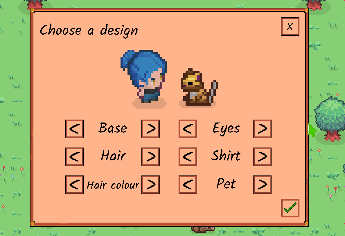 I've completely changed up the way that sprites et recoloured, which means I'm happy to add more colouring options. Now when you create a new save, you can pick from many more hair colours, as well as changing eye and shirt colour. With this system now updated I'm much more comfortable adding more hairstyles, so that can come in a future update. If you've got a specific colour that you want adding to the existing options, just ask!