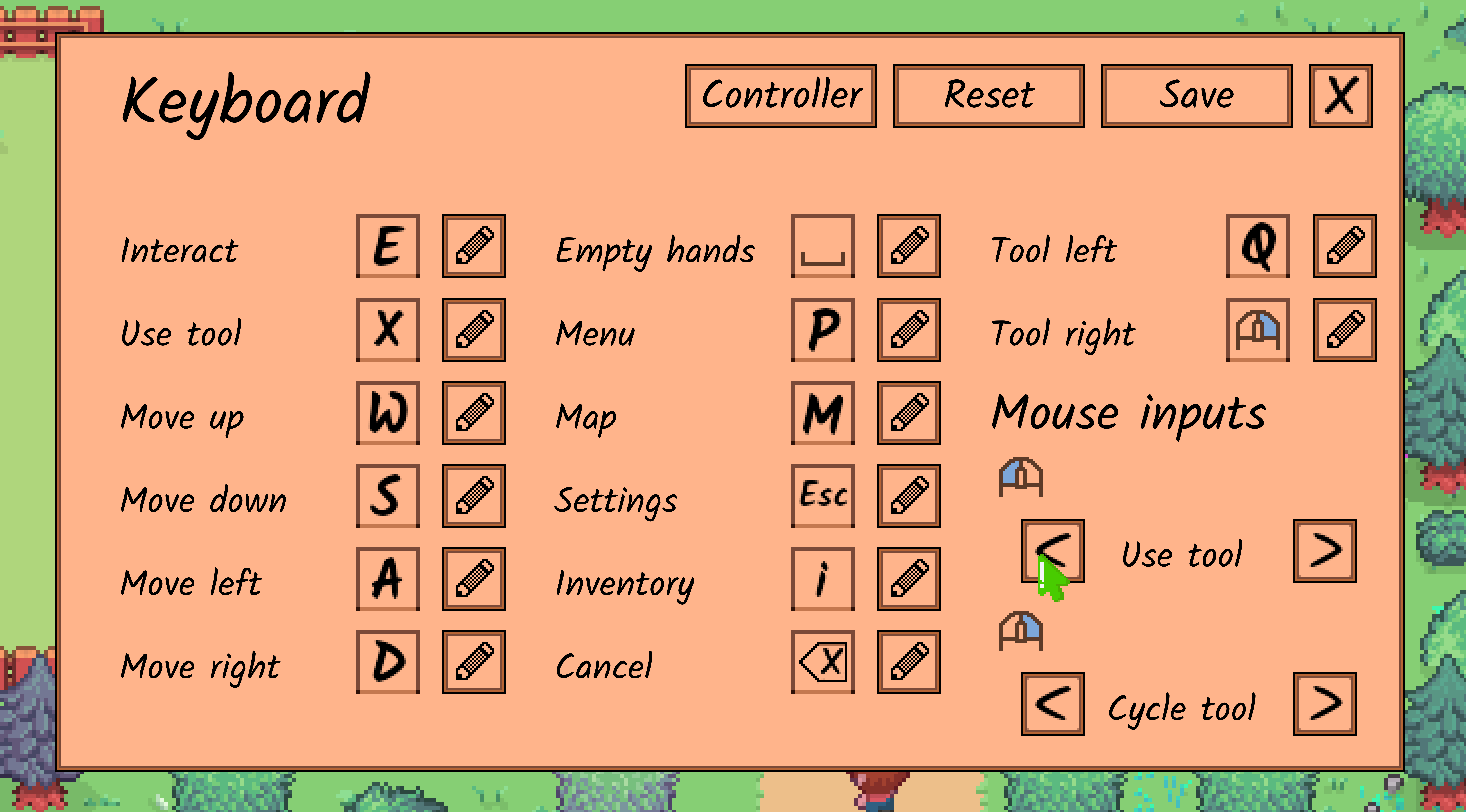 For the mouse, there's a section on the right where you can define the action for the left and right clicks. I've added all the choices that I got from a few players, but if there's additional requests then please get in touch. I very rarely use this feature myself in games, so I looked around at how other similar games do this, but I'm sure there's something I missed!