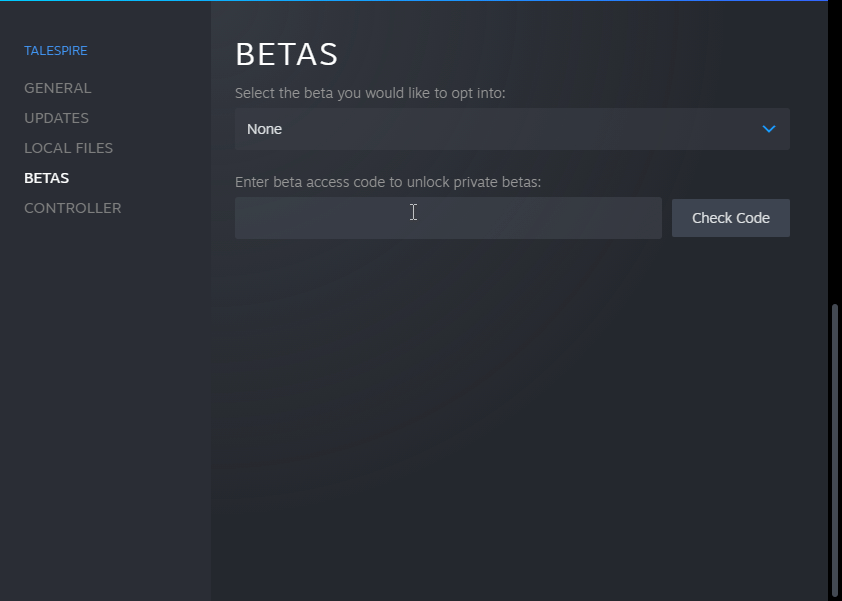 You can access the Branch by inputting the beta password: beta01TestingResolution into Steam TaleSpire Properties. This will allow you to opt into Beta01.
