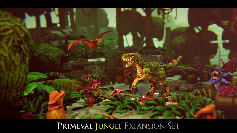 The Primeval Jungle set includes some new tiles to create your own deadly lands, including new jungle floor tiles, vine-covered trees, beautiful (but dangerous) flora, and three new creature minis - the Raptor, the Pterodactyl, and the forementioned flora.