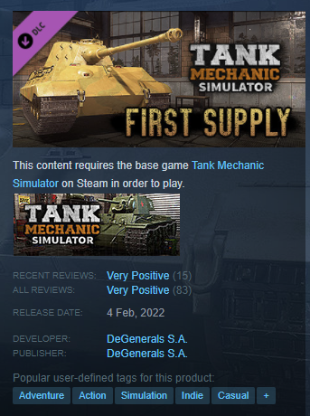 Tank Mechanic Simulator – First Supply DLC – An expansion for Tank Mechanic Simulator which includes 5 new highly detailed vehicles together with 5 engines. Additionally each vehicle contains packs of new museum stands, posters, unique MGs, ammunition, and achievements.