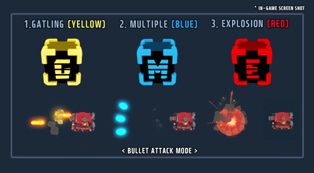 ● There are three types of bullet; Yellow(Gatling), Blue(Multiple), Red(Explosion)