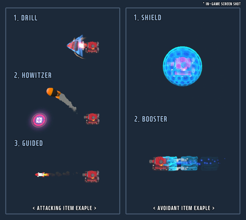 ● There are various type of items; from offence items like Guided, Howitzer etc. to avoidant items like Booster and Shield.