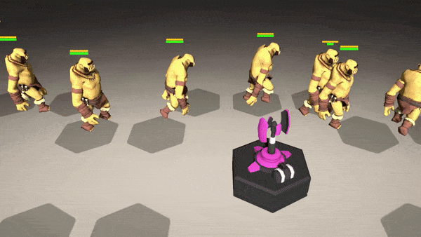 Around this time (early 2019), I decided to start from scratch and build a new version focused on gameplay. I decided not to spend any time in creating any original 3D models - and use off the shelf stuff from Unity asset store. In this iteration I switched from square grid to hexagonal grid. Also I decided to not use Unity's NavMesh for path finding and instead write my own. In retrospect this was the best decision I made. Unity's NavMesh is a sophisticated solution that also incorporates physics into path finding. This was not necessary for my requirement. Due to the physics, the NavMesh solution gets very slow as number of agents increase (about 100+). Also they start behaving erratically. My implementation doesn't care about collisions between attacker units. It scales well and I've been able to tweak the algorithm and data structures as my requirements have changed over time.