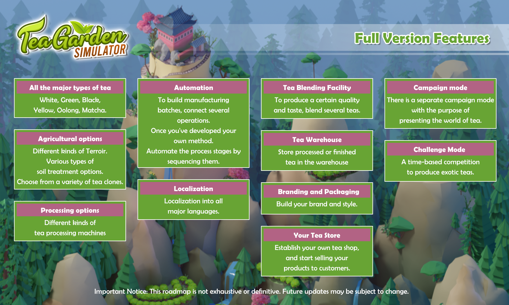 Happy to release the product roadmap of the full version of "Tea Garden Simulator". Do check it out. Let us know how it matched your expectations.