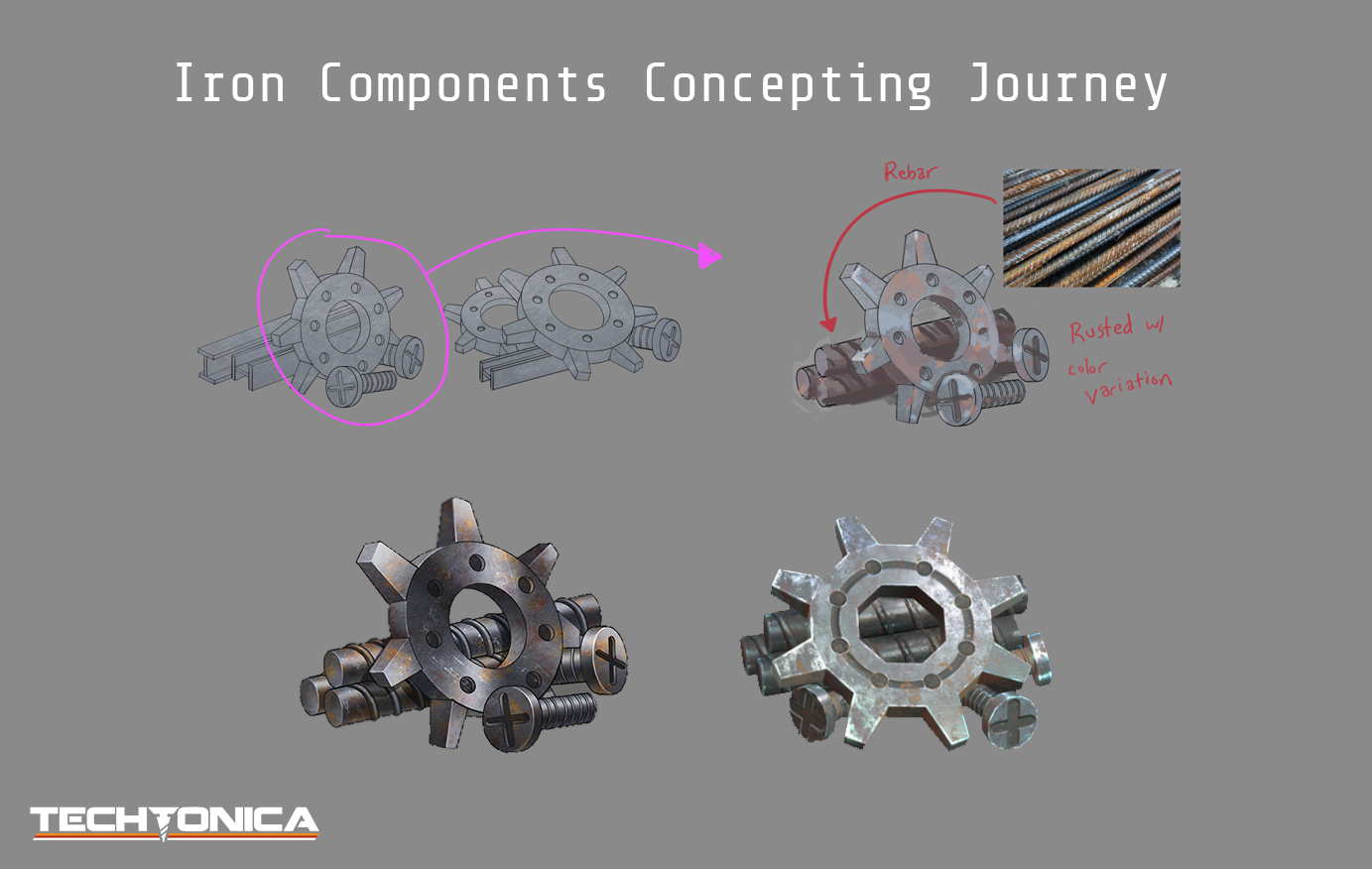 Creating an intermediate, such as Iron Components, starts with sketches against reference pieces. Those sketches get feedback and iteration as the concept moves from idea to model, as seen in macro detail below.