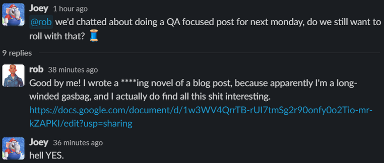 This is why, when you report a bug on our Discord, you’ll often see me sliding into your mentions, asking you questions about what you were doing when it happened, and if you can share your save files or player logs with us. That sort of debugging information is vital, and can often be the difference between an apparently “random” bug that could take us days, weeks, or even months of methodical experimentation to pin down and reproduce, or one that we can get a handle on pretty quickly.