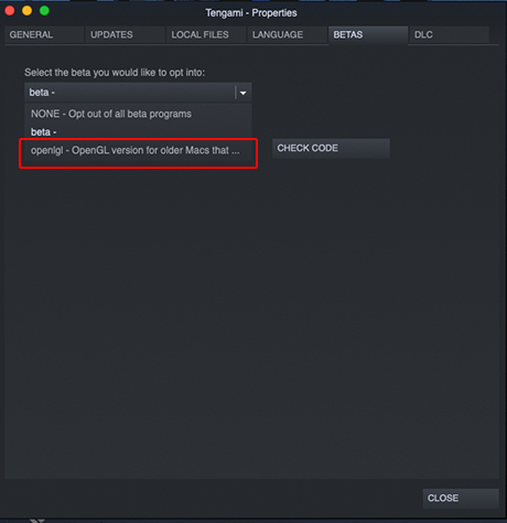 If your Mac is older than 2015 then there is a high chance it is not supporting Apple's graphics API metal. We have provided an Open GL branch for you. In your Steam Library, right click on Tengami and select Properties. Go to the Betas tab and select the "Open GL" branch. In your Steam library the game is now called "Tengami (opengl)".